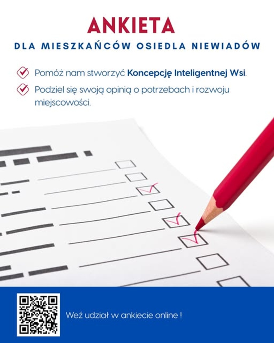 Szanowni Mieszkańcy Osiedla Niewiadów, zwracamy się do Państwa z uprzejmą prośbą o wypełnienie krótkiej ankiety, która posłuży do opracowania Koncepcji Inteligentnej Wsi dla miejscowości Osiedle Niewiadów. Celem ankiety jest poznanie opinii mieszkańców na temat potrzeb, problem...